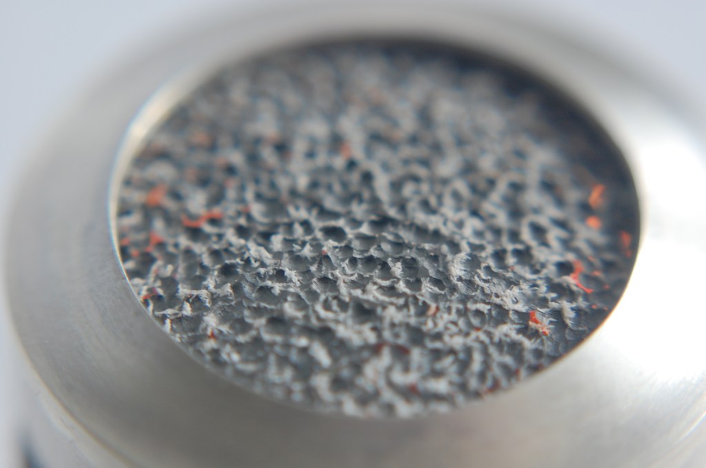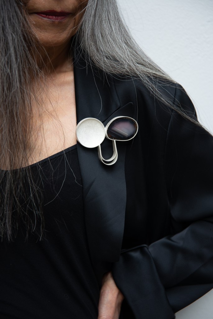 brooch – silver, red orange coated plexiglass, brown agate, stainless steel