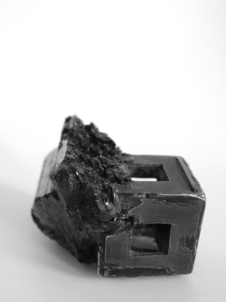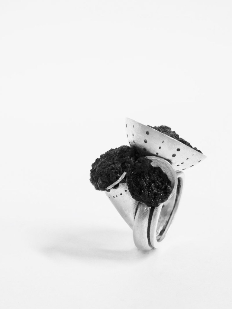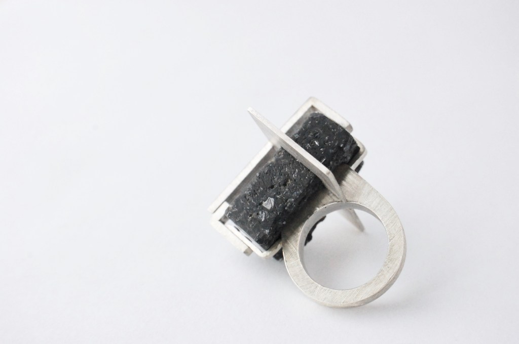 ring – silver, carbon grains, resin / ring – silver, pyrite, resin