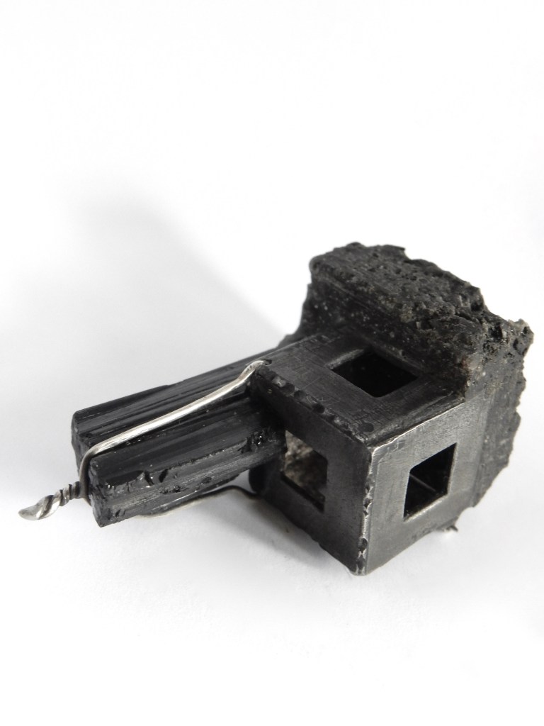 brooch – silver, zinc, tin, resin, lava, black tourmaline, stailness steel / brooch – zinc, tin, stainless steel, resin, black tourmaline / brooch – zinc, tin, stainless steel, resin, brass